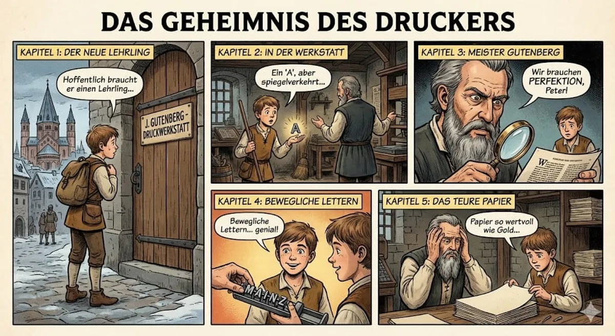 Translation:Peter arrived in Mainz on a cold morning. He was only fifteen years old, but he wanted to work. The city on the Rhine was loud and full of people. Merchants sold their goods and craftsmen worked in their shops. Peter was looking for a special house. He had heard of a man named Johannes Gutenberg. People said this man was working on a secret invention. Peter knocked on a heavy wooden door. His heart beat fast. He hoped that Master Gutenberg needed an apprentice. The door opened slowly and a smell of oil and metal met him.