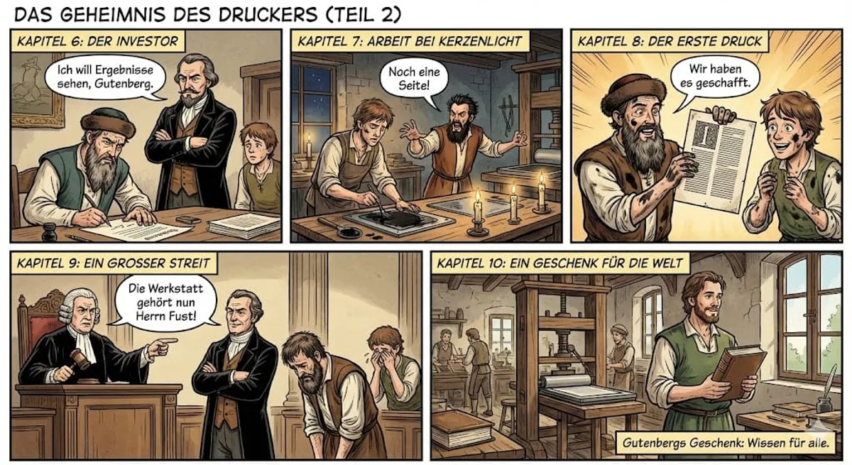 Translation:Finally, everything was ready. The page was set. The paper lay in the press. Gutenberg took a deep breath. He nodded to Peter. Peter pulled on the large lever of the press. The wood groaned under the pressure. Then he let go. Gutenberg took the paper out carefully. The letters were sharp and black. It was perfect. "We did it," whispered Gutenberg. It was the first page of the Bible. It looked beautiful, better than any handwriting. Everyone in the workshop cheered quietly. Peter felt goosebumps. He held the first printed masterpiece in his hands.