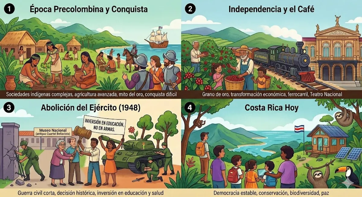 Descubre la historia de Costa Rica: desde sus raíces indígenas y la época colonial hasta su desarrollo como nación pacífica y ecológica.