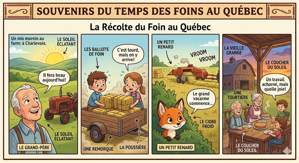 Je me souviens de l'odeur du foin coupé qui flottait dans l'air lourd de juillet. Au Québec, le temps des foins était le moment le plus intense de l'été. Dès l'aube, mon grand-père observait le ciel, cherchant un signe de pluie qui pourrait gâcher la récolte. Nous préparions les machines avec une excitation nerveuse. La chaleur montait rapidement sur les collines de Charlevoix. Les cigales commençaient leur chant monotone pendant que nous buvions de l'eau fraîche du puits. C'était une tradition familiale où chaque membre, des plus jeunes aux plus âgés, avait un rôle crucial à jouer pour remplir la grange.