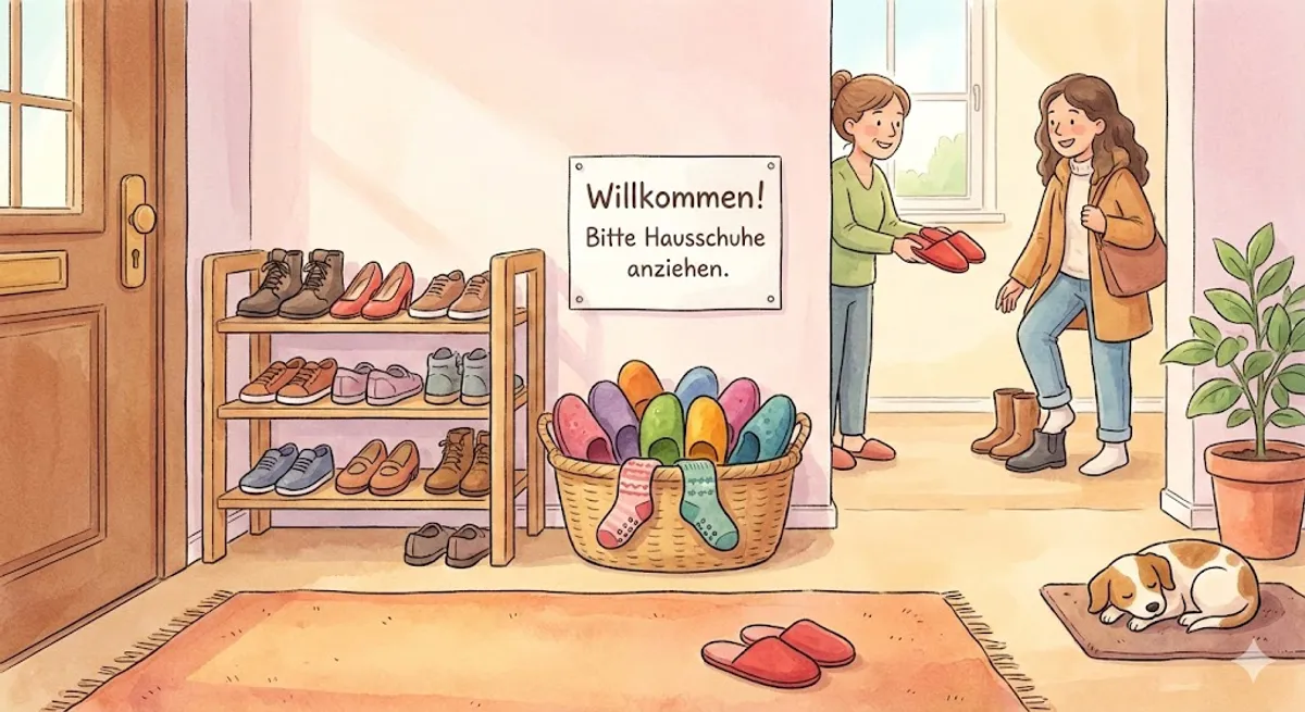 In Deutschland ist Ordnung sehr wichtig. Wenn Gäste eine Wohnung besuchen, ziehen sie oft ihre Schuhe aus. Warum machen sie das? Sie möchten, dass der Boden sauber bleibt. Im Flur gibt es meistens ein Regal für Schuhe. Viele Deutsche tragen zu Hause lieber Hausschuhe. Das sind weiche Schuhe nur für drinnen. Es ist sehr gemütlich und die Füße bleiben warm. In vielen Häusern gibt es auch extra 'Gästepantoffeln'. Das sind Hausschuhe für Besucher. Wenn du eine Wohnung besuchst, fragst du am besten: 'Soll ich meine Schuhe ausziehen?' Die Gastgeber sagen meistens: 'Ja, gerne!'