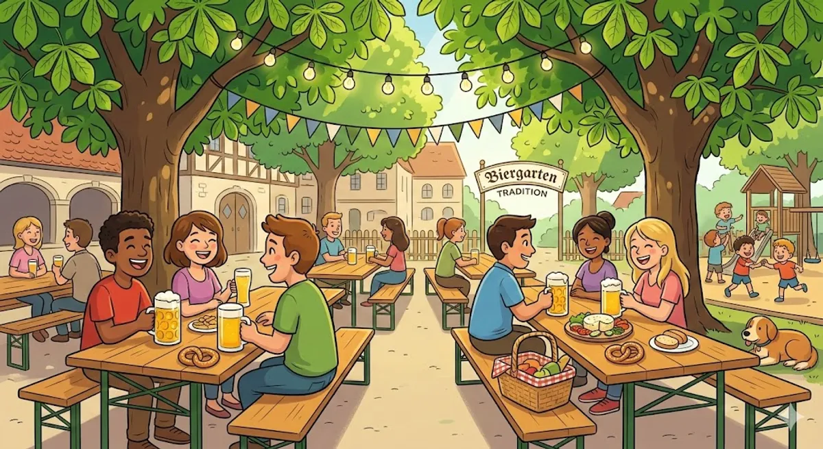 Lerne die deutsche Biergarten-Kultur kennen! Ein einfacher A1-Text über Essen, Trinken und Gemütlichkeit unter Kastanienbäumen.