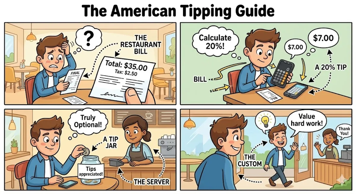 One of the most stressful experiences for newcomers in the United States is paying the bill at a restaurant. Unlike in many other countries where the price on the menu is the final price you pay, American culture relies heavily on 'tipping.' A tip is an extra amount of money you give to your server to thank them for their work. While it might seem optional, it is actually a social requirement in the U.S. because many restaurant workers earn a very low hourly wage and depend on these tips to pay their bills.
