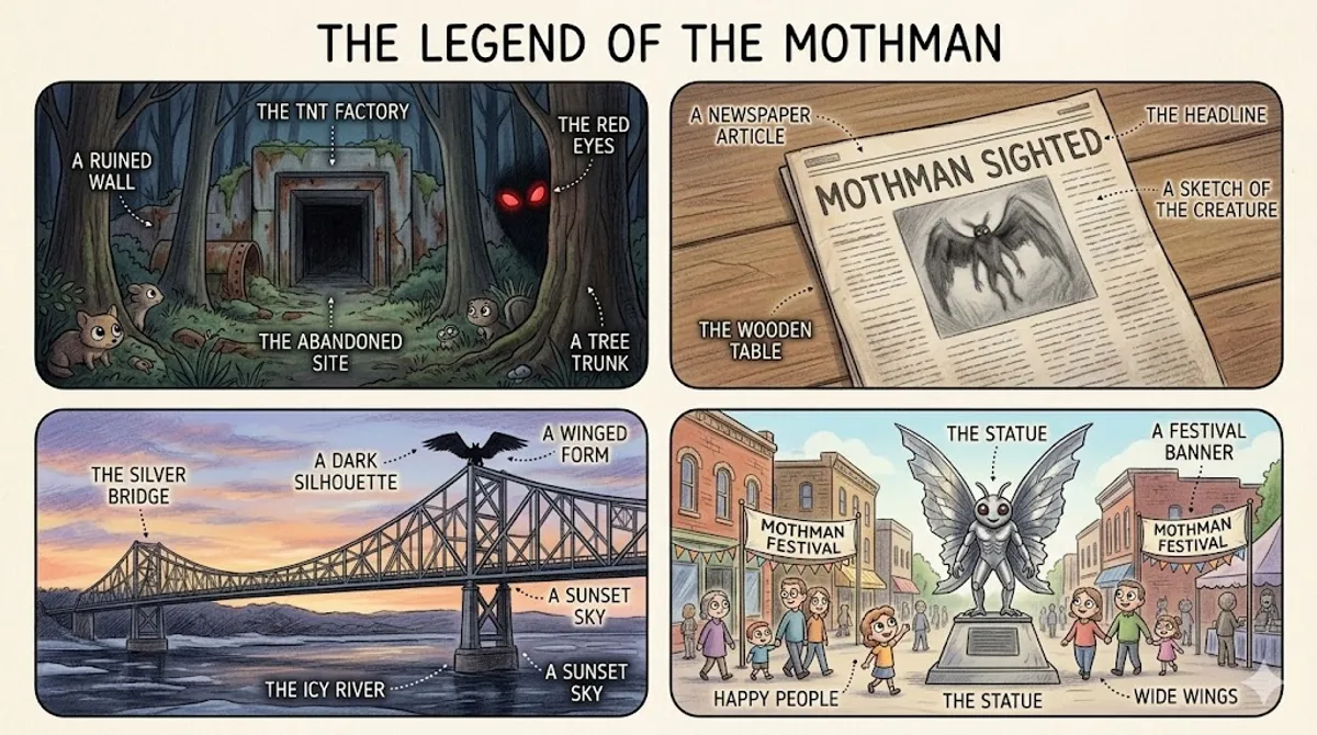 In the late 1960s, a strange series of events occurred in a small, quiet town called Point Pleasant, West Virginia. It all began on a dark night in November 1966, when two young couples reported seeing a terrifying creature near an abandoned TNT factory from World War II. They described a figure that was part man and part bird, standing over two meters tall. Most notably, it had massive wings and glowing, hypnotic red eyes that seemed to pierce through the darkness. The local newspapers quickly gave this mysterious visitor a name: "The Mothman." Following the initial report, dozens of other residents claimed to have seen the creature. Witnesses stated the Mothman could fly faster than a car, keeping pace with vehicles traveling at high speeds. Despite its frightening appearance, the creature never physically attacked anyone. However, its presence created a heavy atmosphere of dread throughout the community. People felt that something terrible was about to happen, and many were afraid to leave their homes after sunset. The most famous and tragic part of the story is the connection to a local disaster. Throughout 1967, sightings continued until a cold December evening. On December 15, the Silver Bridge, which connected Point Pleasant to Ohio, suddenly collapsed into the icy Ohio River. This tragedy resulted in the deaths of 46 people. Afterward, rumors spread that the Mothman had been seen standing on the bridge’s steel beams just days or even hours before it fell. Many locals began to believe the creature was a "harbinger"—a supernatural sign of bad luck or an omen sent to warn the town about the impending disaster. While some skeptics believe the sightings were actually a large bird, like a sandhill crane, or even a prank, the legend remains a significant part of American folklore. Today, Point Pleasant celebrates its history with a shiny metallic Mothman statue in the center of town and an annual festival that attracts thousands of fans. Even though there have been no recent sightings, the mystery of the Mothman continues to scare and fascinate people from all over the world.