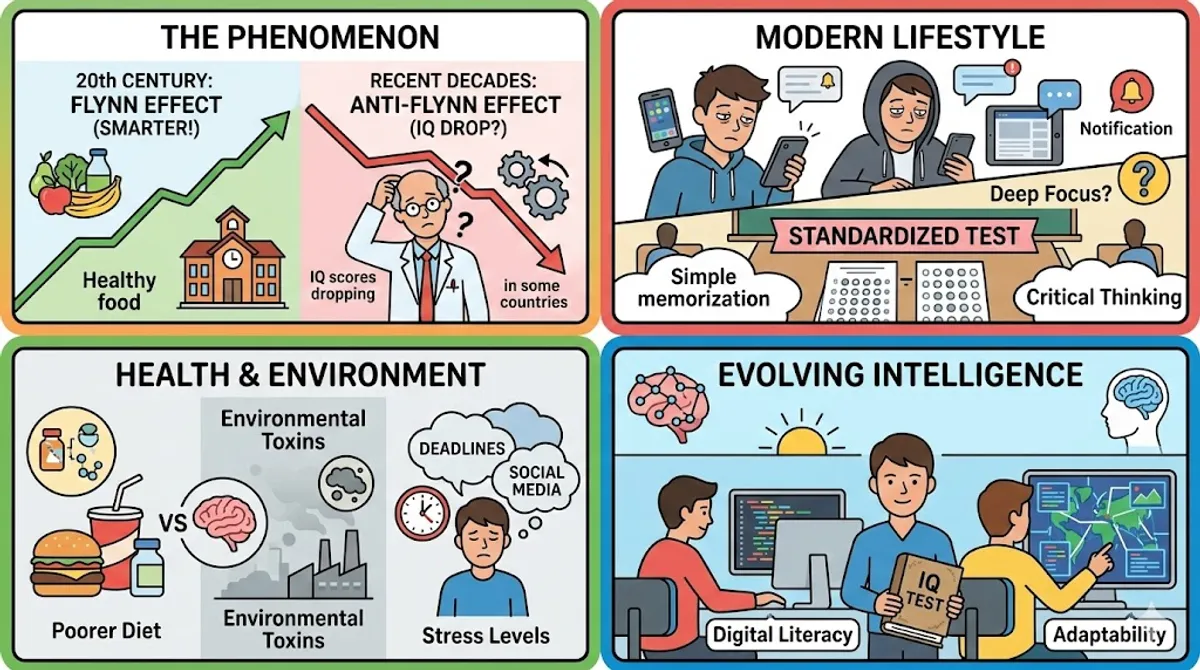 For most of the 20th century, intelligence quotient (IQ) scores consistently increased around the world. This positive trend, known as the Flynn effect, was linked to better nutrition, improved education, and healthier environments. However, in recent decades, researchers have noticed a worrying shift. In several developed countries, such as Norway, Denmark, and the UK, the IQ scores of young people are actually lower than those of previous generations. This phenomenon is often called the "anti-Flynn effect." Scientists are puzzled by this decline and are urgently trying to figure out why modern youth might be scoring lower on traditional intelligence tests.