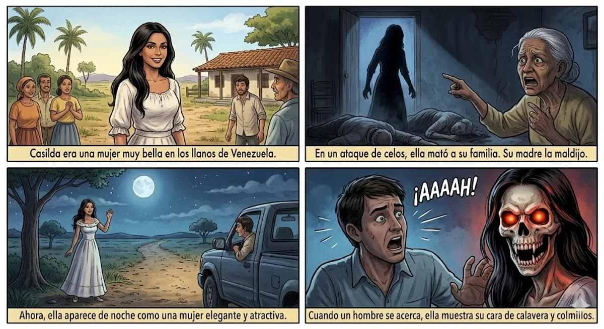 La Sayona es una de las leyendas más famosas de los llanos venezolanos. Se trata del espíritu de una mujer muy bella llamada Casilda. Se dice que, en un ataque de celos ciegos, Casilda mató a su esposo y a su madre. Antes de morir, su madre la maldijo para siempre. Desde entonces, ella aparece en las carreteras o cerca de los pueblos como una mujer elegante y atractiva. Su objetivo es atraer a los hombres que son infieles o que tienen malas intenciones con las mujeres. Cuando un hombre intenta conquistarla, ella muestra su verdadera identidad: su rostro se convierte en una calavera con colmillos terroríficos y sus ojos se vuelven rojos como el fuego.
