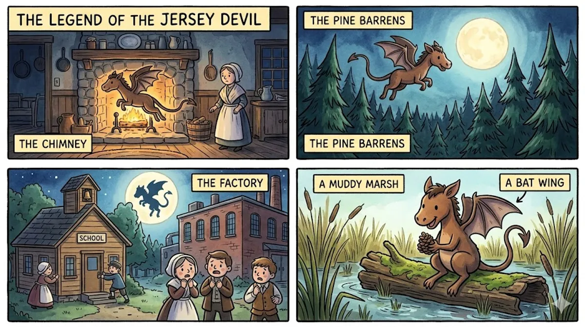 New Jersey is a busy state known for its crowded cities, but hidden within its borders lies a dark, quiet area called the Pine Barrens. This massive forest spans over one million acres of thick pine trees and sandy soil. For over 250 years, locals have shared terrifying stories about a mysterious creature living deep within the woods known as the Jersey Devil. According to the local legend, the creature was born in 1735 as the thirteenth child of a woman named Mother Leeds. The story says that Mother Leeds was frustrated by her many children and cursed her unborn baby. When the child was born, it transformed into a terrifying beast with the head of a horse, the leathery wings of a bat, and a long, thin tail. It let out a blood-curdling scream and flew up the chimney, escaping into the forest. In 1909, the legend reached a fever pitch. Hundreds of people claimed to see the Jersey Devil in one single week across various towns. The panic was so intense that schools and factories closed because people were too afraid to leave their homes. Police officers even shot at the creature as it flew over the marshes, but it escaped unharmed. Today, many people still report hearing strange screams at night. While skeptics think it is just a large bird or perhaps a stray lemur, others are certain the Jersey Devil is still guarding its territory in the shadows of the pines.