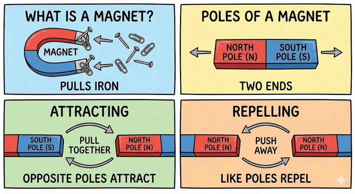 Magnets are special stones or pieces of metal. They can pull some metals, like iron, towards them. Every magnet has two ends called poles. One is the North Pole and the other is the South Pole. If you put two North Poles together, they push each other away. This is called repelling. If you put a North Pole and a South Pole together, they pull together. This is called attracting. We use magnets in many places. They hold pictures on our refrigerators. We also use them in compasses to find directions. Magnets are very useful tools.