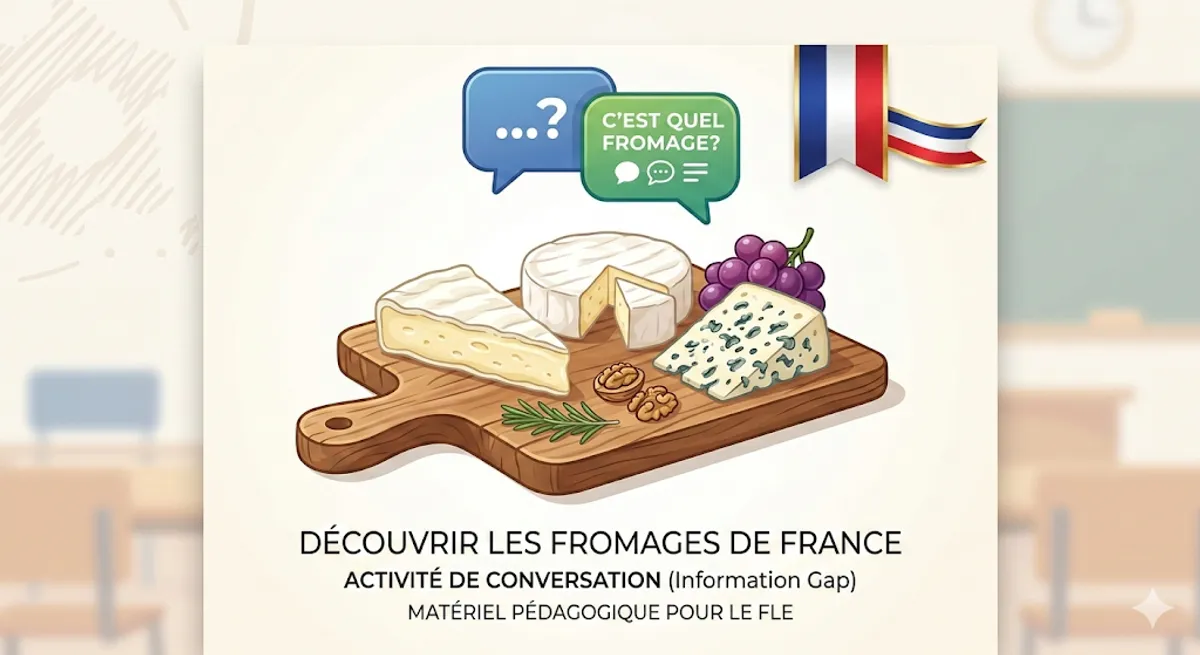 Master French culinary vocabulary with this B1-B2 info-gap activity. Students converse to discover the origins, legends, and production secrets of iconic French cheeses like Camembert and Roquefort.