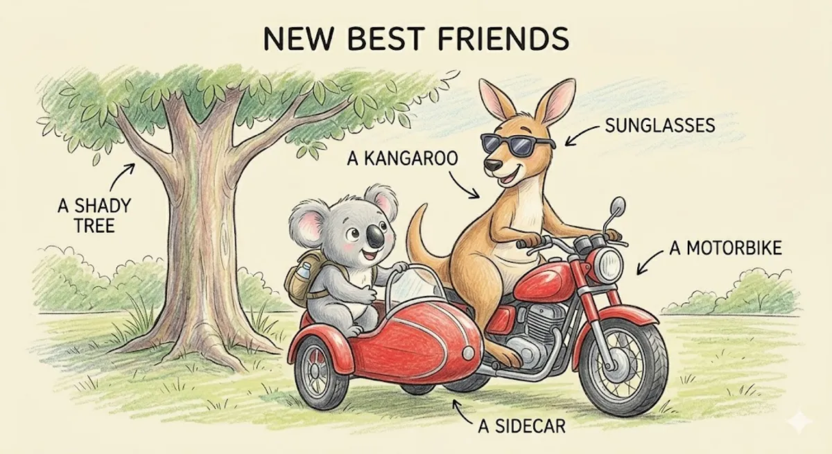 Episode 10: New Best Friends After his pie, Kevin goes to a park because he wants to rest. He sits under a shady tree, but suddenly he hears a loud noise. Vroom! A tall kangaroo stops next to him on a bright red motorbike. The motorbike has a small sidecar attached to it. "G'day! I'm Joey," the kangaroo says. He has a big smile and he is wearing cool sunglasses. Joey is loud and funny, so Kevin likes him immediately. "What are you doing in Sydney?" Joey asks. "I am traveling to the Great Australian Party in Perth," Kevin explains. Joey laughs. "That is a very long walk for a koala! Do you want a ride?" Kevin looks at his tired feet, then he looks at the sidecar. He smiles. "Yes, please!" šØ Aussie Talk Joey is a true Australian "larrikin." A larrikin is someone who is a bit cheeky, funny, and loves a good joke. His name is Joey, which is actually the word for a baby kangaroo, but he uses it as his name! š Grammar Spotlight Look at the highlighted words: because, but, and, so. These are called Conjunctions. We use them to connect two sentences or ideas together. Because gives a reason. But shows a contrast or difference. And adds information. So shows a result.