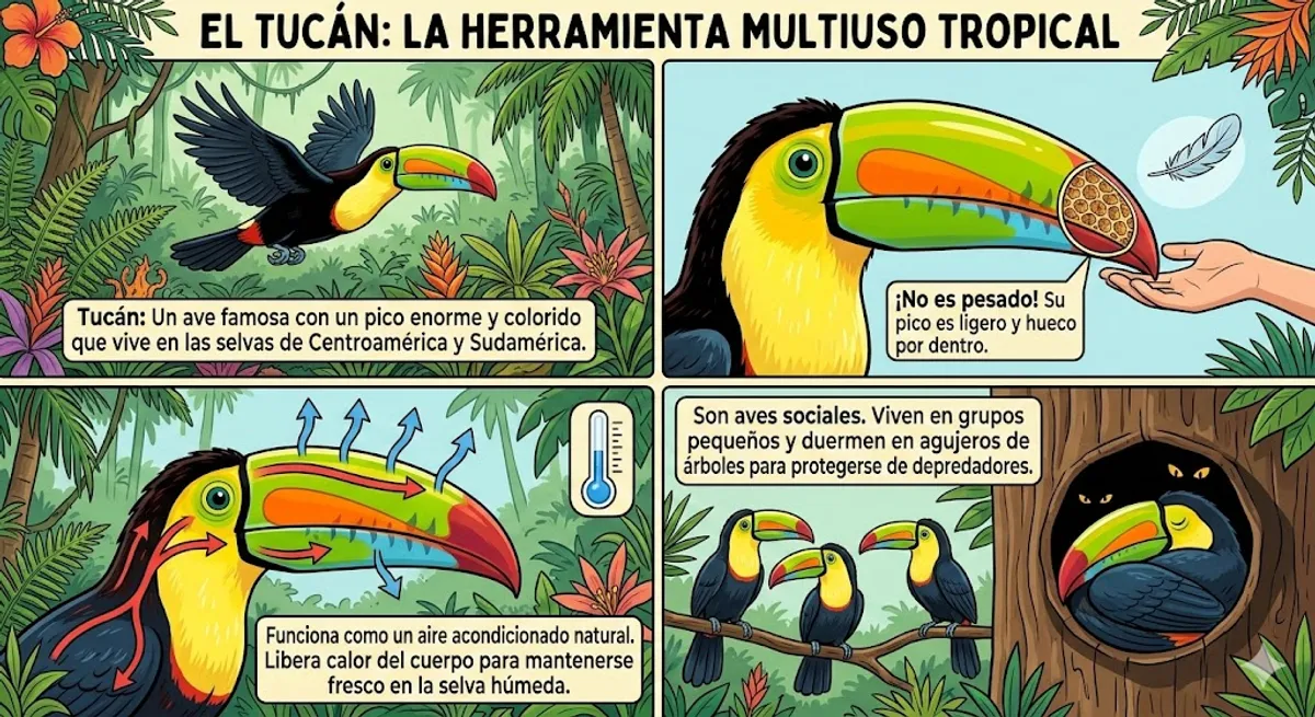El tucán es un ave famosa que vive en las selvas de Centroamérica y Sudamérica. Es muy conocido por su pico enorme y colorido. Muchas personas piensan que el pico es pesado, pero en realidad es muy ligero porque es hueco. Este pico no es solo para comer frutas; funciona como un aire acondicionado natural. El tucán bombea sangre a su pico para liberar calor y mantenerse fresco en la selva húmeda. Además, los tucanes son aves sociales que viven en grupos pequeños. Duermen en agujeros de árboles para protegerse de los depredadores.