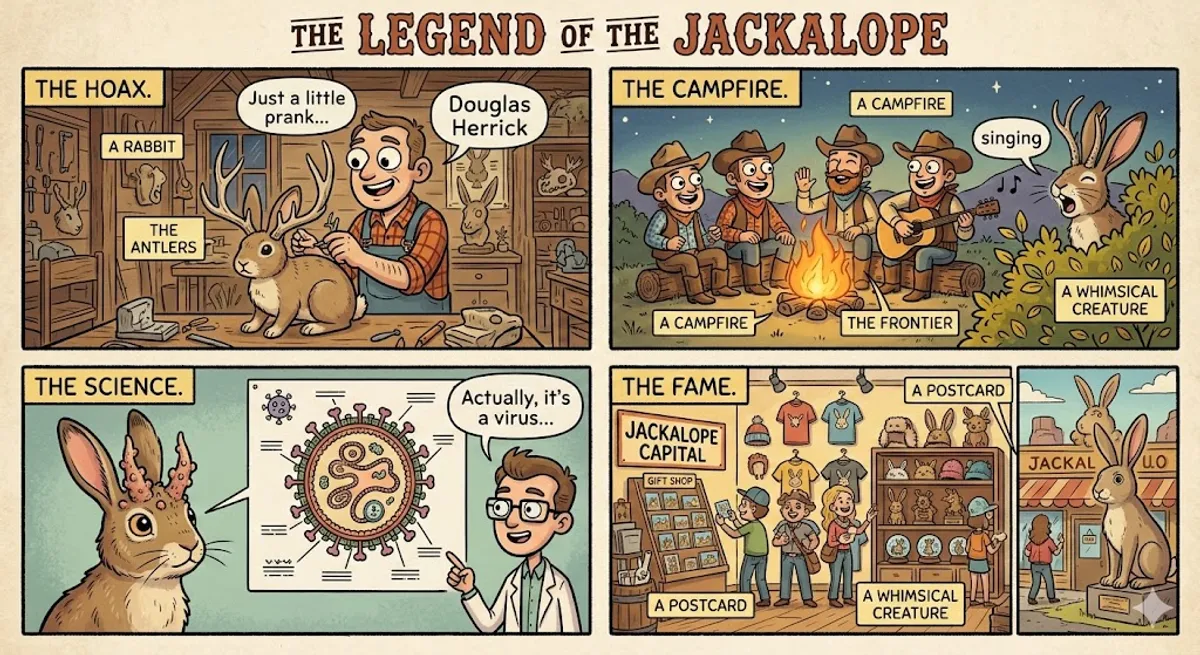 In the American West, tourists often find strange postcards in gift shops. These cards show a rabbit with the antlers of an antelope or a deer. This funny creature is called the Jackalope. Unlike the scary monsters in other legends, the Jackalope is a whimsical creature—meaning it is lighthearted and playful. The story of the Jackalope became famous in Douglas, Wyoming, during the 1930s. A resident named Douglas Herrick, who was skilled in taxidermy, decided to graft deer antlers onto a rabbit's body. This clever hoax quickly turned into a local sensation. According to local legends, Jackalopes are very difficult to catch because they are elusive and incredibly fast. They are also said to be very clever. Some stories say that Jackalopes can imitate human voices. If a group of cowboys is singing around a campfire at night, the Jackalope might hide in the bushes and sing along with them! Some people even claim they only breed during lightning storms, adding to the exaggerated nature of the story. While the Jackalope is a famous tall tale, there is a scientific side to the story. Scientists believe the legend may have started because of the Shope papilloma virus, which causes rabbits to grow hard, horn-like tumors on their heads. To a person living on the frontier in the 1800s, such a rabbit would look like a magical species. Today, the Jackalope remains a popular symbol of the humorous spirit of the American West, and Douglas, Wyoming, is officially recognized as the 'Jackalope Capital of the World.'