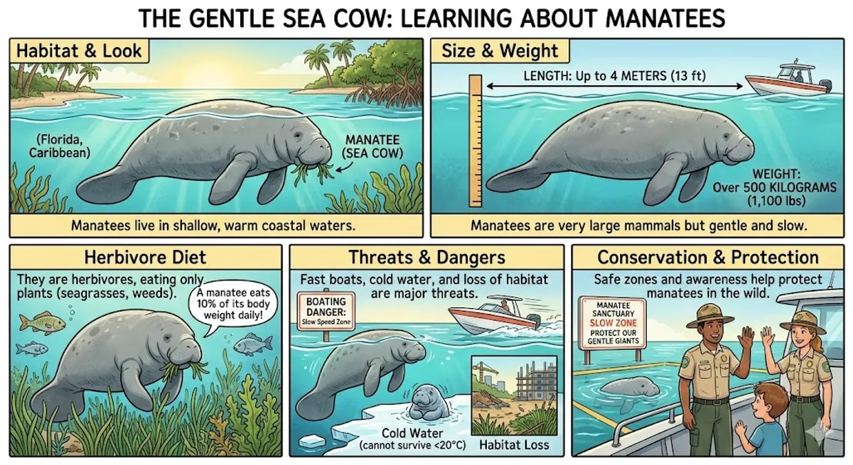 Manatees are large, gentle marine mammals often called "sea cows." They live in shallow, warm coastal waters and rivers, mostly in Florida, the Caribbean, and parts of South America. Adult manatees can grow up to four meters long and weigh over 500 kilograms. Despite their huge size, they are very peaceful creatures that spend most of their time eating, resting, and traveling. Manatees are herbivores, meaning they only eat plants. A manatee can eat up to a tenth of its own body weight in water grasses and weeds every day! Because manatees move very slowly and stay near the water's surface, they face several dangers. One of the biggest threats to manatees is getting hit by fast-moving boats. They also suffer from habitat loss and cold water temperatures, as they cannot survive in water colder than 20 degrees Celsius. In recent years, conservationists have been working hard to protect them by creating safe zones where boats must drive slowly. By raising awareness and protecting their environments, we can help ensure that these unique animals continue to survive in our oceans and rivers.