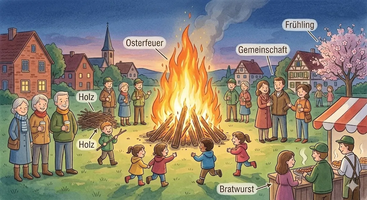 Lerne die deutsche Tradition des Osterfeuers kennen! Entdecke Vokabeln über den Frühling und Gemeinschaft in diesem einfachen A1 Text.