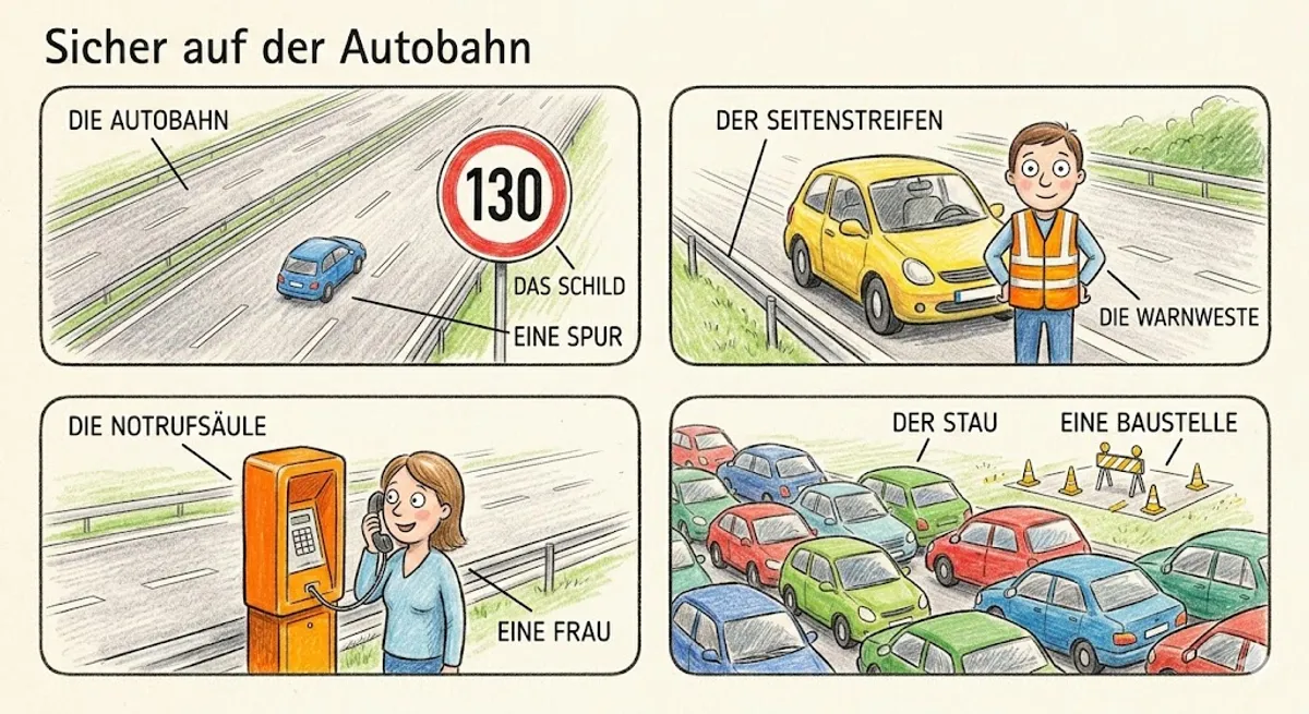 Sicherheit: Schutz vor GefahrAnhalten: mit dem Auto stoppenVerboten: man darf es nicht machenDer Seitenstreifen: der Platz rechts neben der FahrbahnDie Warnweste: eine Kleidung mit SignalfarbenDer Fahrer: eine Person, die Auto fährtDie Notrufsäule: ein spezielles Telefon für HilfeDie Hilfe: Unterstützung bei ProblemenDas Benzin: Energie für das AutoDie Strafe: Geld bezahlen, wenn man etwas falsch machtQuestions:- Question: Darf man auf der Autobahn anhalten, um Fotos zu machen?Answer: False