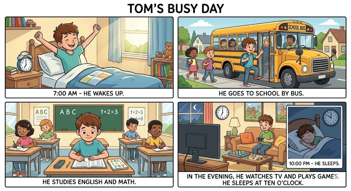 My brother Tom has a busy day. He wakes up at seven o'clock. He goes to school by bus. He studies English and math. School finishes at three o'clock. In the evening, he watches TV and plays games. He sleeps at ten o'clock.