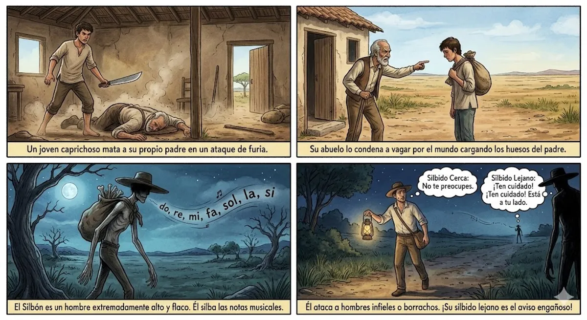 En las vastas llanuras de Venezuela y Colombia, existe una figura que aterra a los viajeros nocturnos: El Silbón. Según la leyenda, era un joven caprichoso que, en un ataque de furia, mató a su propio padre. Como castigo, su abuelo lo condenó a vagar por el mundo cargando un saco lleno de los huesos de su progenitor. El Silbón es descrito como un hombre extremadamente alto y flaco, tanto que parece un esqueleto. Lo más aterrador de su presencia no es su apariencia, sino su silbido. Él silba las notas musicales do, re, mi, fa, sol, la, si en un tono muy particular. Hay un detalle muy extraño en su silbido: es un aviso engañoso. Si escuchas el silbido muy cerca, no tienes de qué preocuparte, porque el espíritu está lejos. Pero, si el silbido suena lejano y débil, ten cuidado: El Silbón está justo a tu lado. Generalmente, ataca a los hombres que beben demasiado o que son infieles, recordándoles que sus acciones tienen consecuencias.
