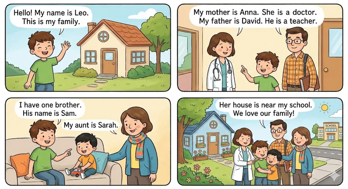 Hello! My name is Leo. This is my family. My mother is Anna. She is a doctor. My father is David. He is a teacher. I have one brother. His name is Sam. My aunt is Sarah. Her house is near my school. We love our family!