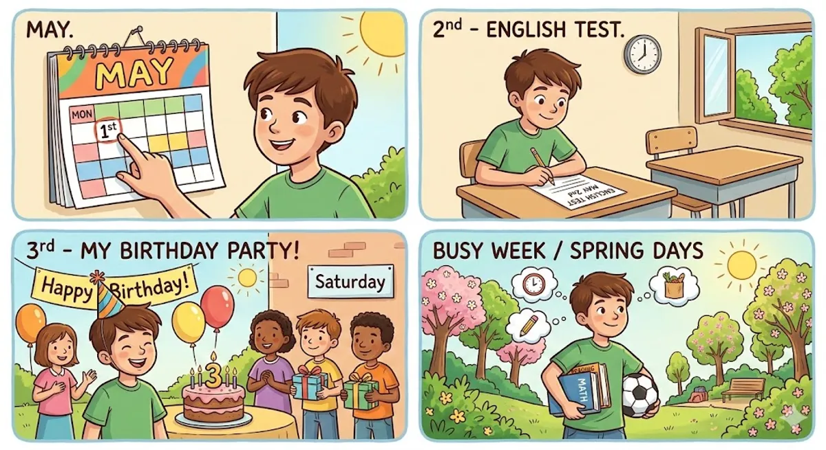 My favorite month is May. The 1st of May is a Monday this year. I have an English test on the 2nd. My birthday is on the 3rd of May! I always have a fun party on Saturday. The second week is very busy. I love spring days!